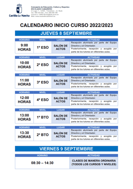 Calendario Inicio Curso 2022/2023